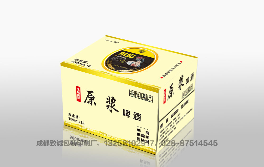 在炎熱的夏天,啤酒是大家非常喜歡喝的酒品之一,在酒吧、家庭聚會、看球的時候再不能喝酒的人也會喝上幾罐啤酒。而啤酒是水和茶之后世界上消耗量排名第三的酒品,所以,在國內生產啤酒的廠家也很多,如雪花啤酒、哈爾濱啤酒、燕京啤酒等等,各地的啤酒口味也因為各地產的小麥不同而味道不同,今天成都包裝廠小編不是要介紹啤酒,而是要為您介紹一款精釀原漿啤酒紙箱包裝,如下圖: