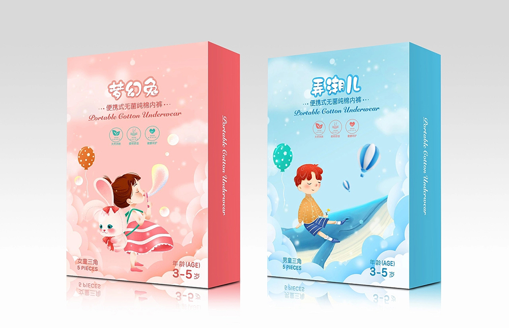 設計理念:本款包裝是兒童內褲外包裝,包裝盒封面設計大膽的采用了卡通形象繪畫形式,其設計以夸張、提煉的手法再現原型,形象即可以滑稽、可愛,也可以嚴肅、莊重。外包裝上的簡潔、逗趣的卡通形象會激發兒童對產品的興趣。很多企業也關注到消費者群體年輕化的發展趨勢,故此希望借助產品包裝上的卡通形象來吸引消費者,打造自己獨特的品牌文化,以個性的包裝定制進一步擴大產品的市場份額。