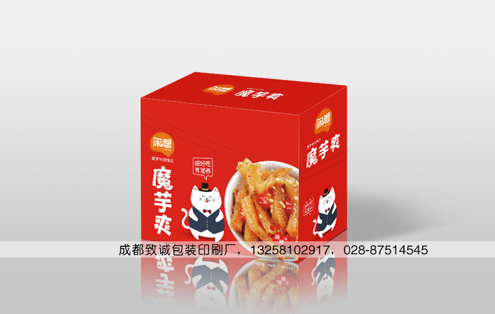 素毛肚又名魔芋爽,因其是用魔芋粉制成而得名;魔芋爽既有毛肚的爽脆口感、又有素菜的美容瘦身功能,所以受到廣大好吃嘴的喜愛,在超市的零食區(qū)總是能看到素毛肚整齊的擺放在貨架上,有的是一袋袋的,也有的是一盒盒的,我公司專業(yè)為各大廠家定制生產(chǎn)各類食品紙盒,也包括素毛肚包裝盒,如下面這款: